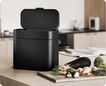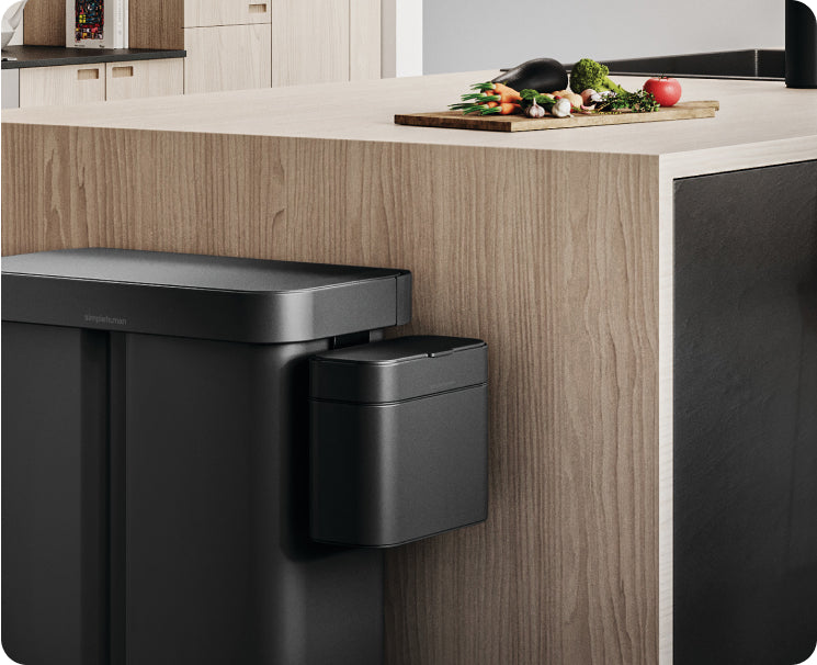 Nuestro cubo para basura orgánica se acopla cómodamente al lateral de los cubos de Simplehuman y te anima a separar los residuos orgánicos, haciendo que la gestión de residuos sea más eficiente