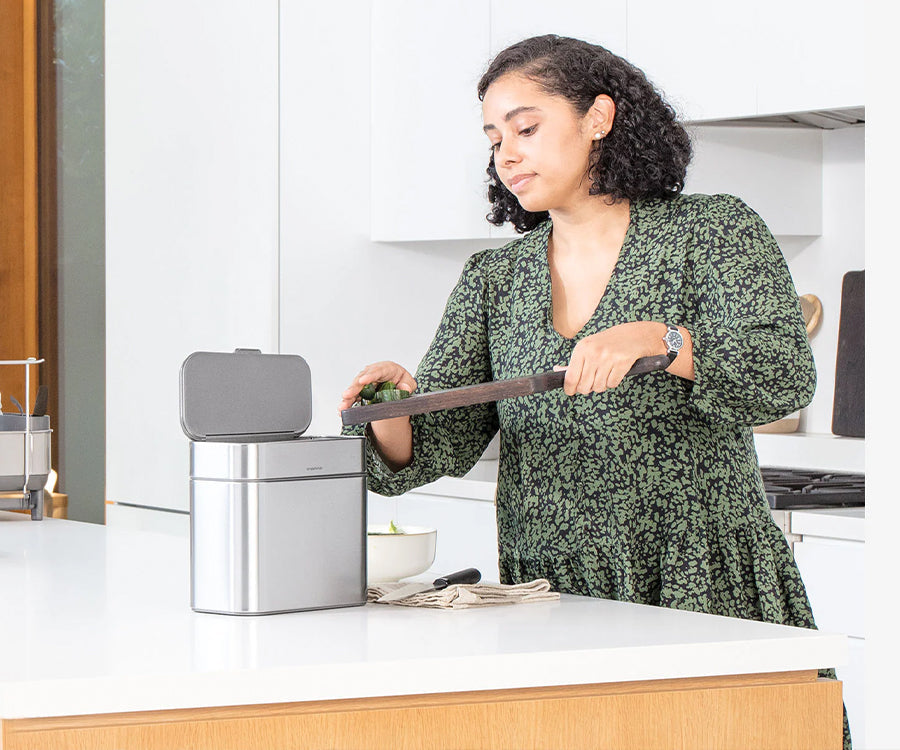 El cubo para basura orgánica se extrae fácilmente de la base magnética para usarse en la encimera de la cocina durante la preparación de la comida y la limpieza.