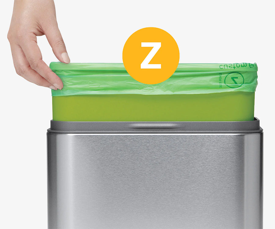 Nuestras bolsas de basura compostables de código Z y a medida se adaptan perfectamente a nuestro cubo para basura orgánica sin sobresalir y están certificadas como compostables, de modo que puedes tirarlas y se descompondrán por completo.