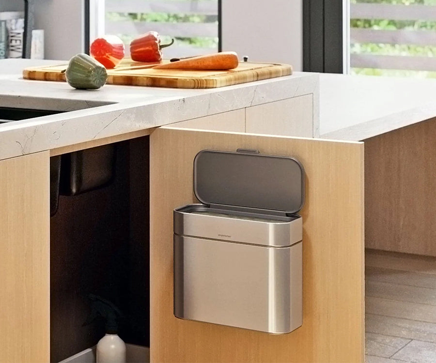 Cuelga el cubo para basura orgánica de forma segura y discreta bajo el fregadero de la cocina o en la pared con el soporte de pared para cubo para basura orgánica. El cubo para basura orgánica se adjunta de forma magnética, para facilitar la recogida de los restos de comida.