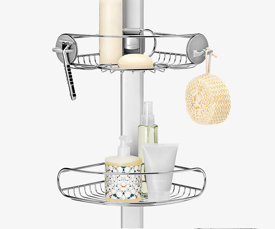 Las repisas con estructura de metal ajustables te permiten personalizar la estantería para la ducha. Deslízalas arriba y abajo para que haya espacio para las botellas más altas.