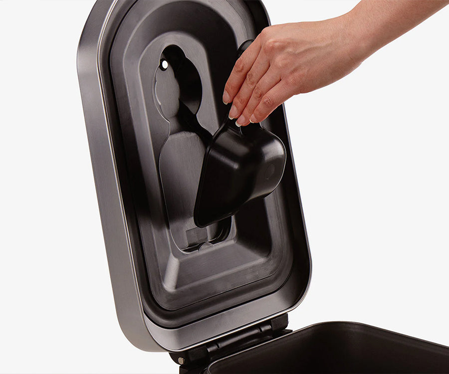 La pala de medición montada en la tapa se adhiere de forma magnética debajo de la tapa, para no tener que ir a tientas en el momento de suministrar la comida.