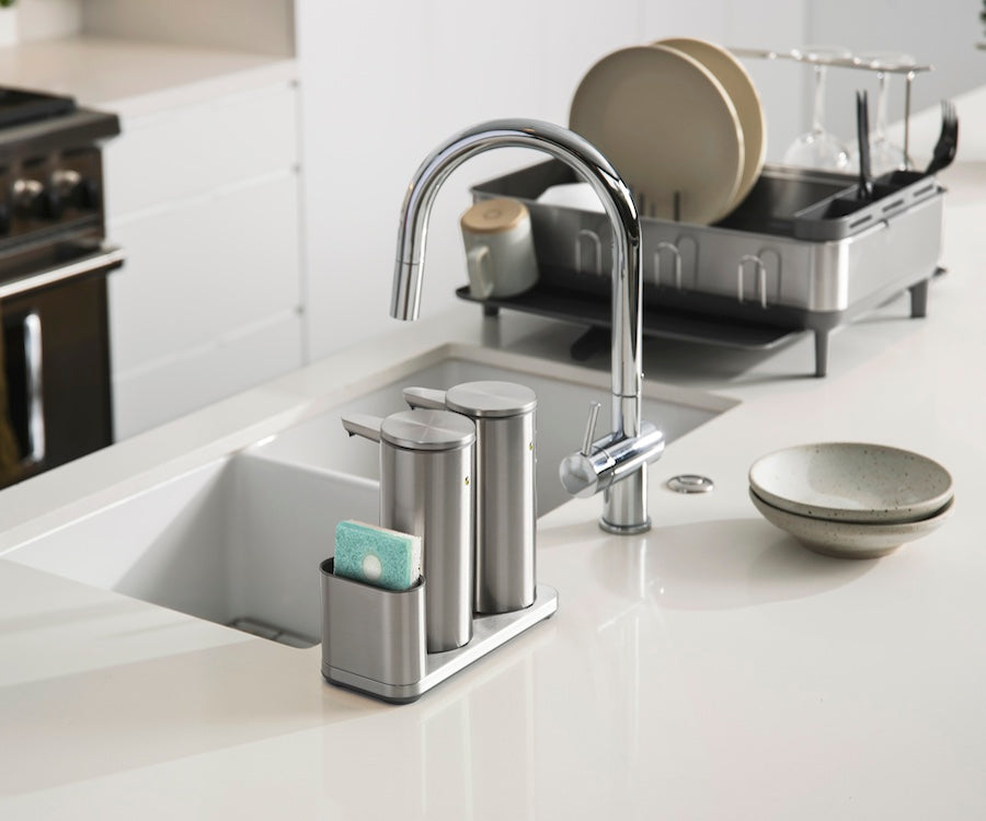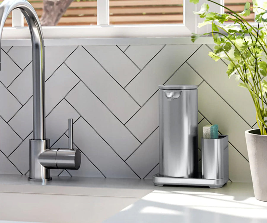 Dale a tu dosificador y estropajo un hogar de hermoso diseño con nuestra porta esponja de acero inoxidable. Mantén la zona del fregadero ordenada.