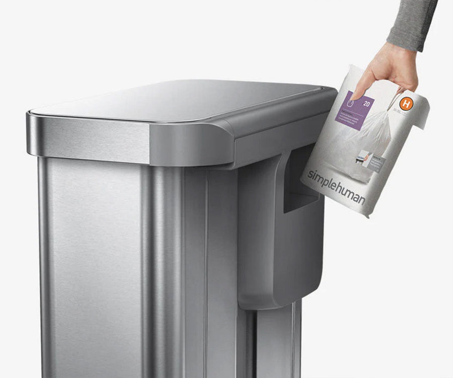 ¡Nuestro exclusivo sistema de borde para bolsa ofrece una forma más limpia y rápida de tirar la basura! El borde exterior se levanta para facilitar el acceso a la bolsa de basura. No es necesario retirar la parte superior del cubo ni pelearte con un cubo interior. Una vez terminada la tarea, el borde se cierra sobre la bolsa de basura y evita que quede a la vista.