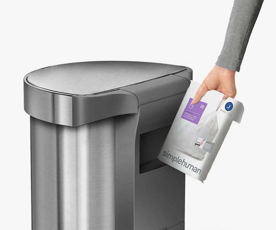 Con nuestro bolsillo para bolsas podrás guardar fácilmente un paquete de 20 bolsas a medida dentro del cubo para que nunca tengas que buscarlas.