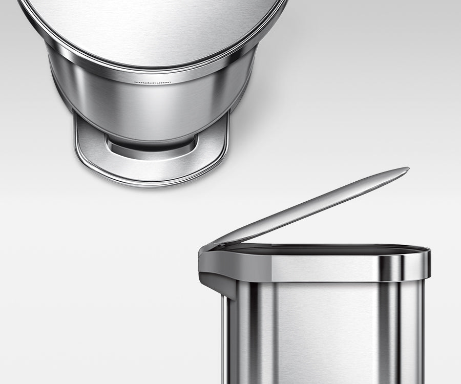 Nuestro pedal de acero macizo está sólidamente construido para durar más de 150.000 pisotones (lo cual equivale a más de 20 pisotones al día durante 20 años), y nuestra tecnología de tapa patentada lid shox controla el movimiento de la tapa, garantizando un cierre silencioso y suave.