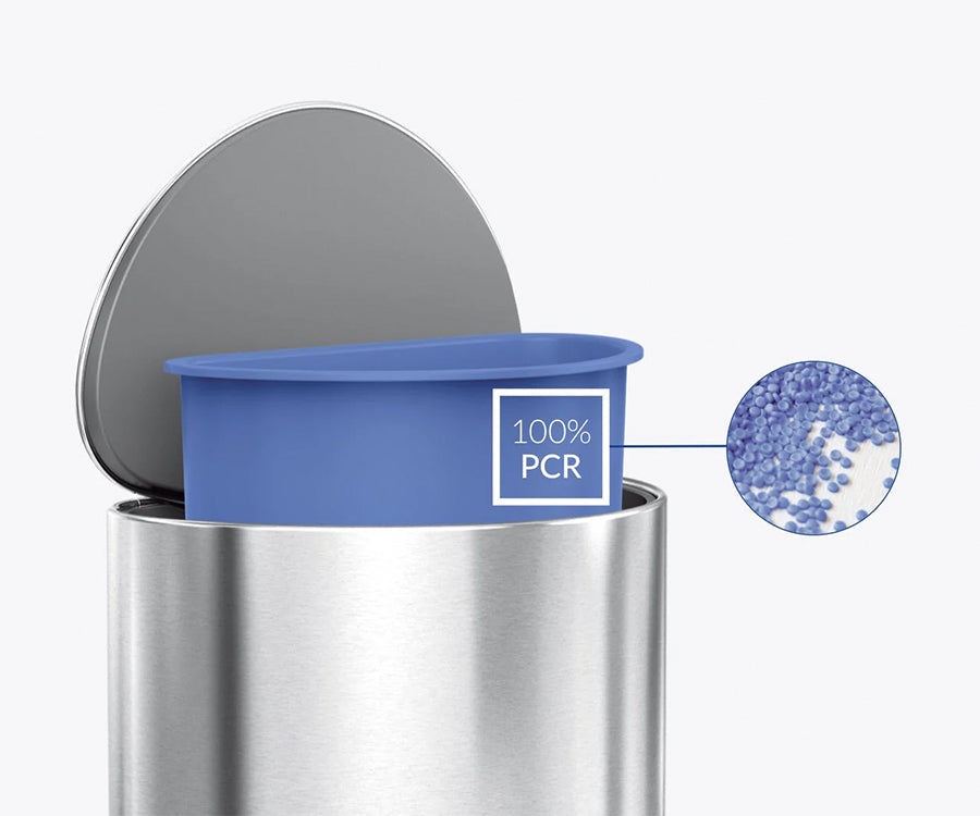 Hecho 100 % de plástico reciclado posconsumo, el cubo interior se puede extraer para cambiar rápidamente la bolsa y facilitar la limpieza.