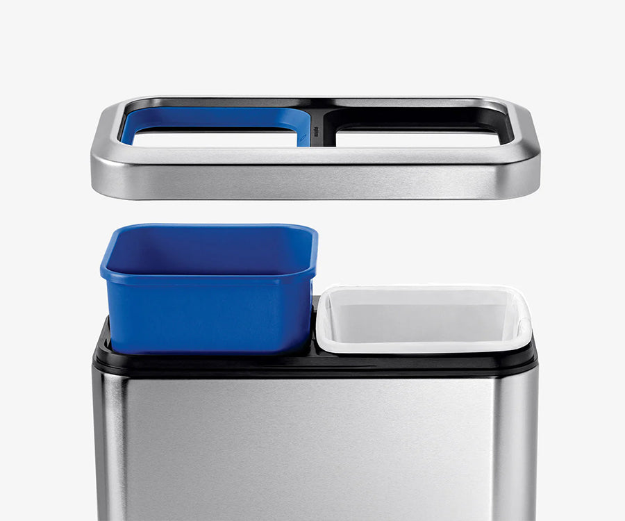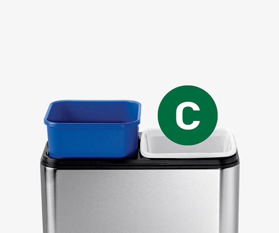 Nuestra opción de doble compartimento clasifica la basura orgánica y los reciclables en este cubo de doble compartimento. Con este cubo, ser ecológico ocupa muy poco espacio.