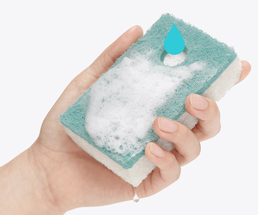 El estropajo está elaborado con fibras de agave azul naturales, mientras que la esponja es 100 % celulosa vegetal.