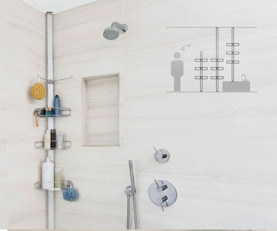 La barra de aluminio tensora reforzada con resorte de gran presión y pies de goma anti-deslizantes de 1,5 a 2,4 metros (mediano) o de 1,8 a 2,7 metros (grande) se adapta a la mayoría de duchas y bañeras.