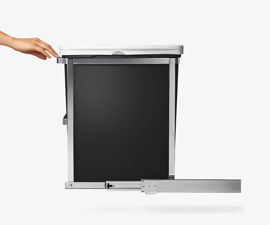 Nuestro cubo extraíble está diseñado para tener muchos años de vida. Este cubo tiene una resistente estructura de acero y se desliza por completo del armario sobre unos rieles con rodamientos de bolas de uso comercial para permitir un acceso rápido y sencillo.